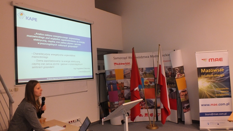„Analizę sektora energetycznego województwa mazowieckiego pod względem zapotrzebowania na energię elektryczną, cieplną oraz paliwa płynne i gazowe w poszczególnych sektorach gospodarki” przedstawiła Pani Magdalena Wielomska z Krajowej Agencji Poszanowania Energii S.A
